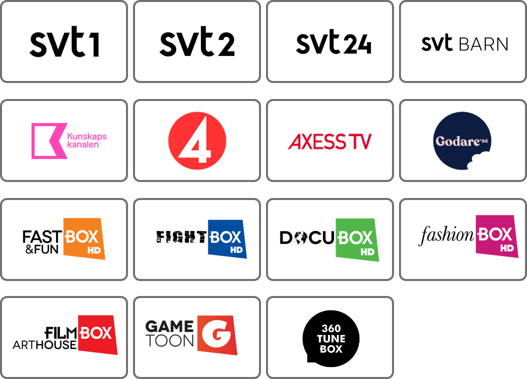 SVT1, SVT2, SVT24, SVT Barn/Kunskapskanalen, TV4, Axess TV, Godare, DocuBox, FashionBox, Fast&FunBox, FightBox, GameToon, FilmBox Arthouse och 36o TuneBox. Samt Play-biblioteken SVT Play, TV4 Play och AxessTV Play.